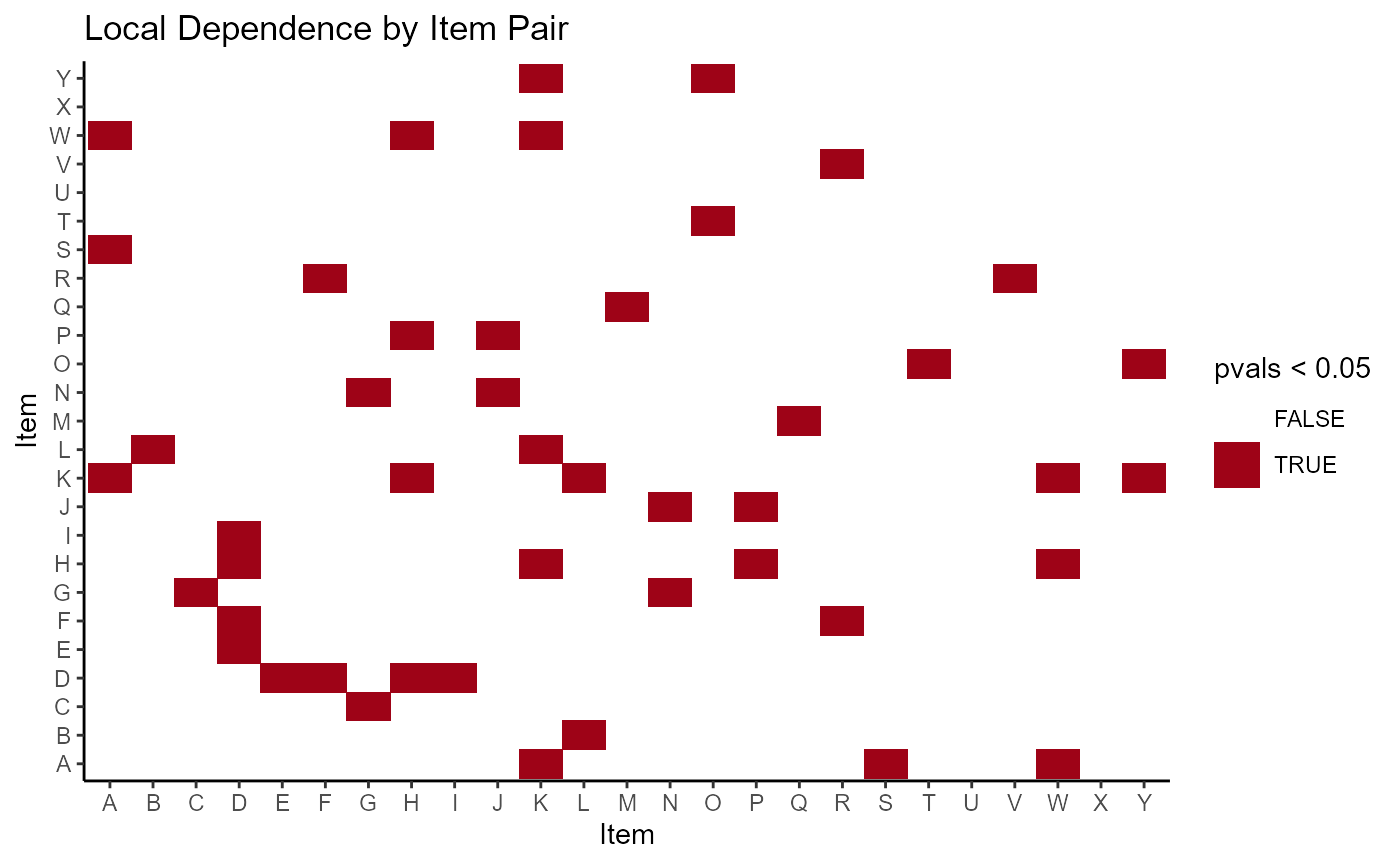 Local dependence uses a combination of the standardized LD statistic as calculated by mirt::residuals-method(). The p-value is also included. The correlations (ccov) are from the ltm package with its ltm::rcor.test() function. The statistics are calculated for each pair of items, and the pairs are arranged by decreasing values of the standardized LD. There is a plot method for assessing local dependence as well. I will forgo the print method and only show the plot method for the purposes of space.