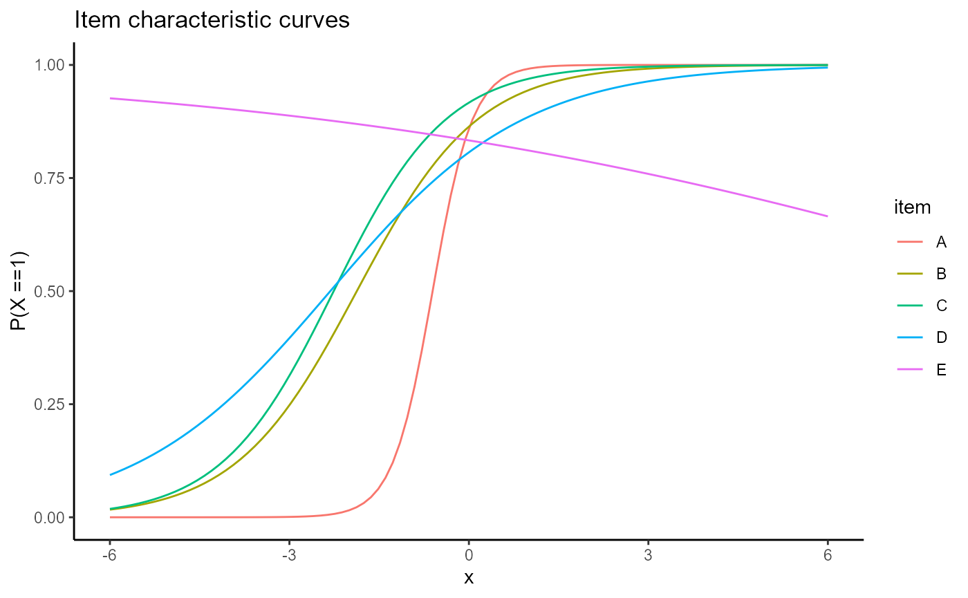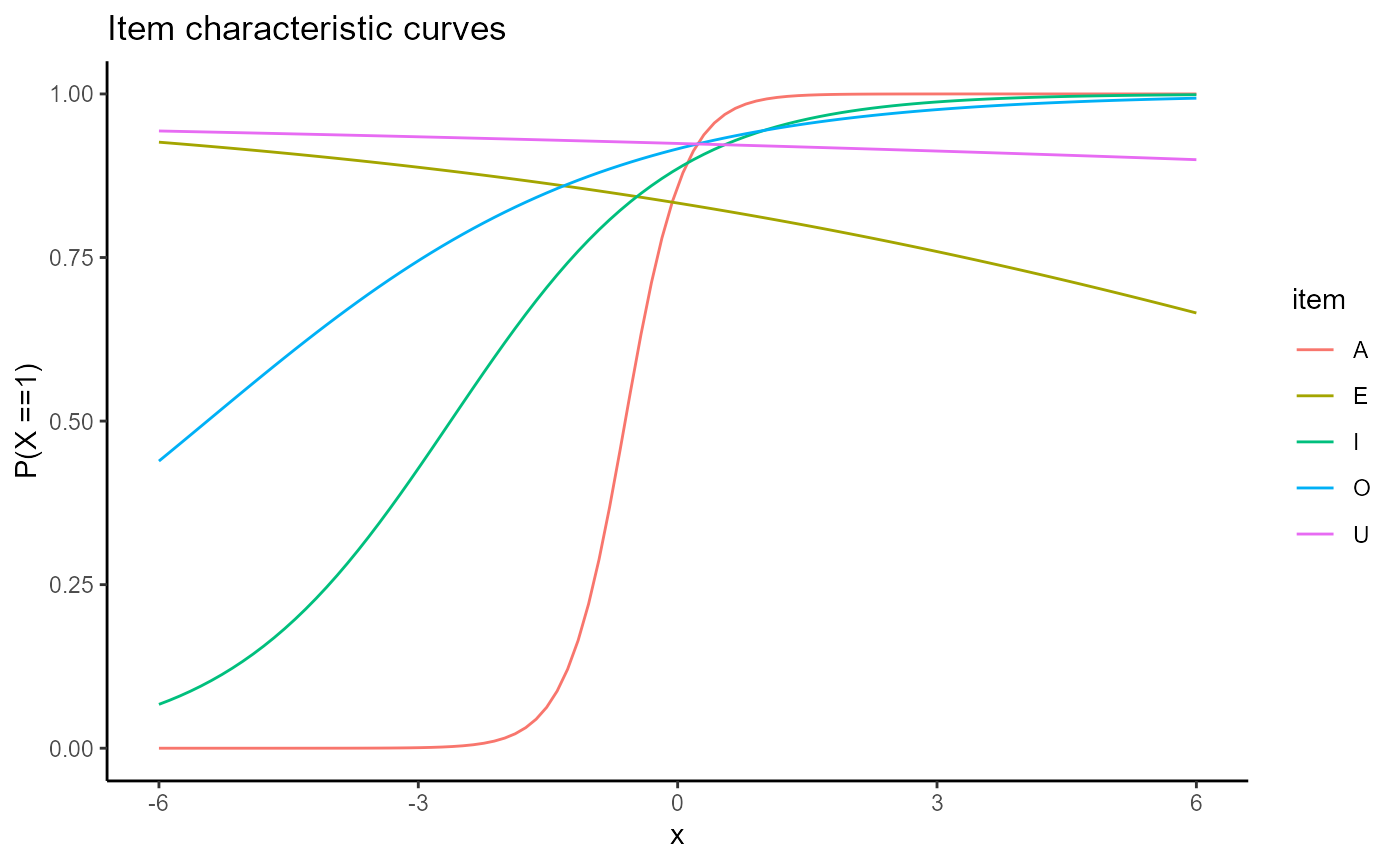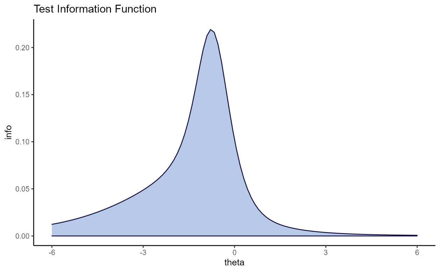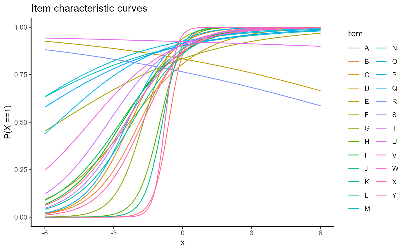 Previously, we saw that it is possible to get item-level statistics using the pring function and setting type = “item”. But there is more item-level information available through plot() and through irt_item_fit().