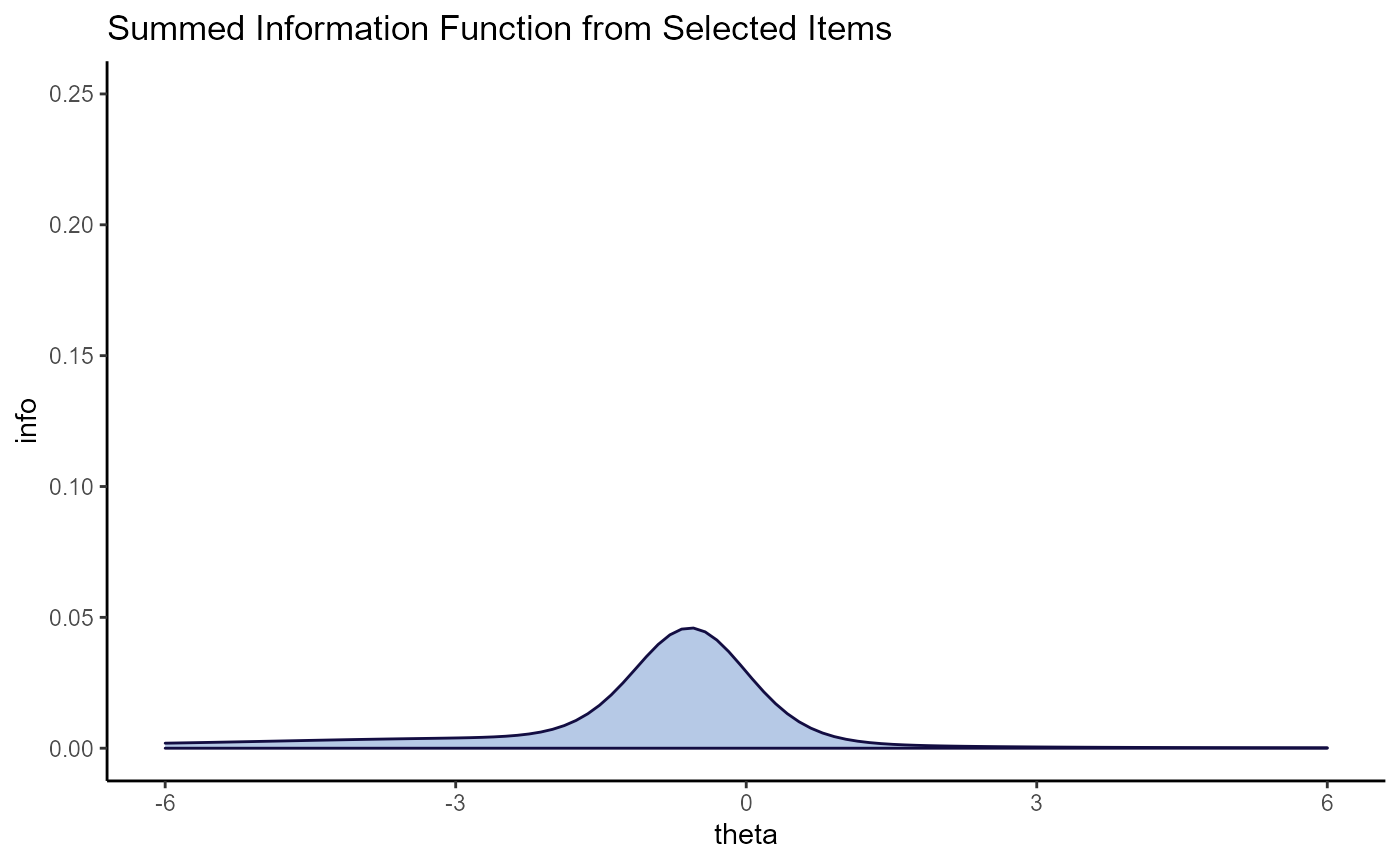 plot(mod2, type = "tinfo", items = selection) + ggplot2::labs(title = "Summed Information Function from Selected Items") + ggplot2::ylim(c(0, .25))
