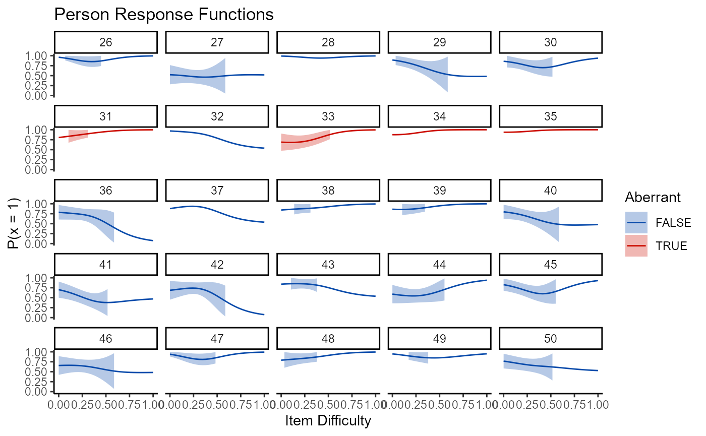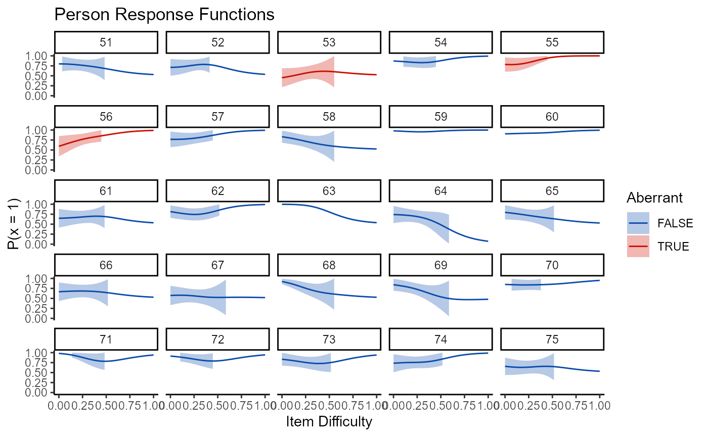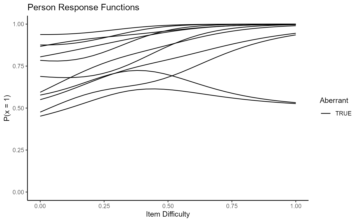 Individuals may be interested in only plotting those who are flagged as aberrant. This can be done with the persons argument, similar to how the which function was used in conjunction with the items argument to plot only items with negative discrimination.