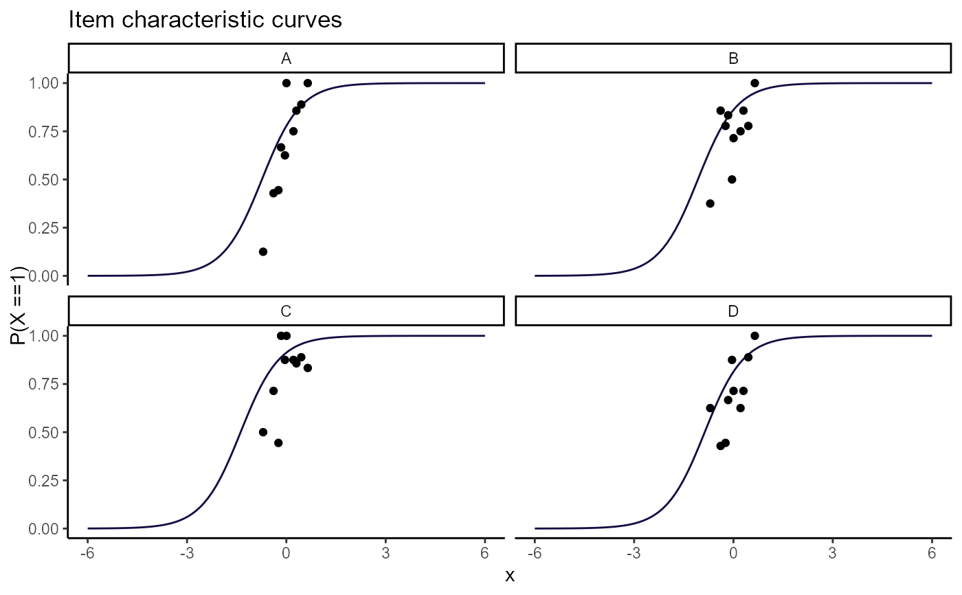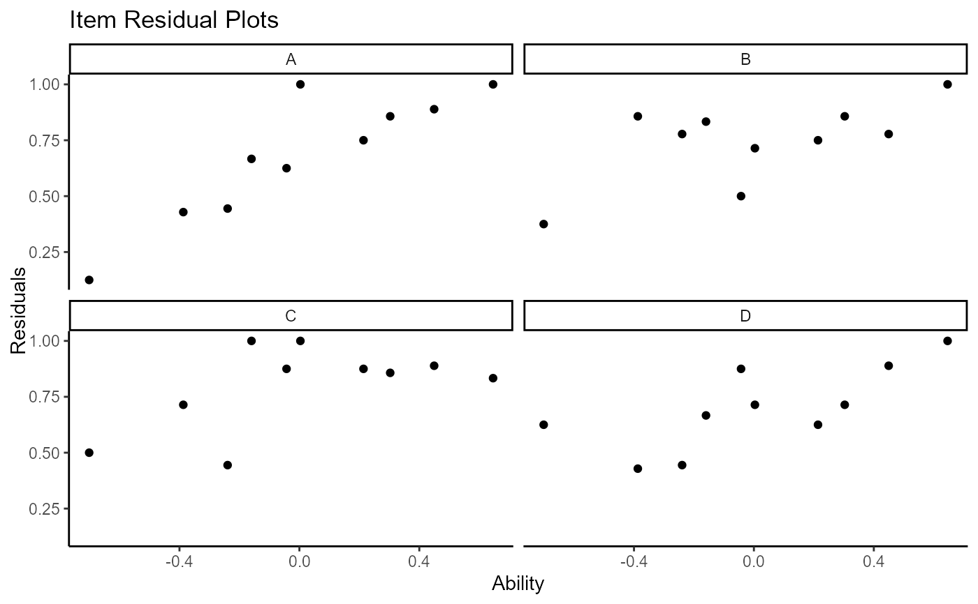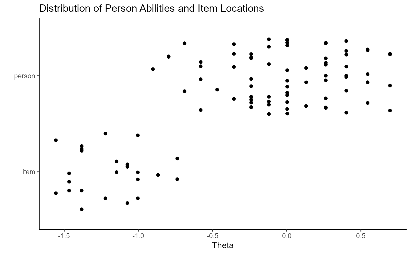 All plots in wizirt use ggplot2 as a backend. Type 'theta_diff' also uses gghalves. For the item-focused plots, the types can be included in the same string to overlay the plots (e.g. resid_trace). For large numbers of persons and/or items, you may want to consider limiting the number printed at a time on some plots.