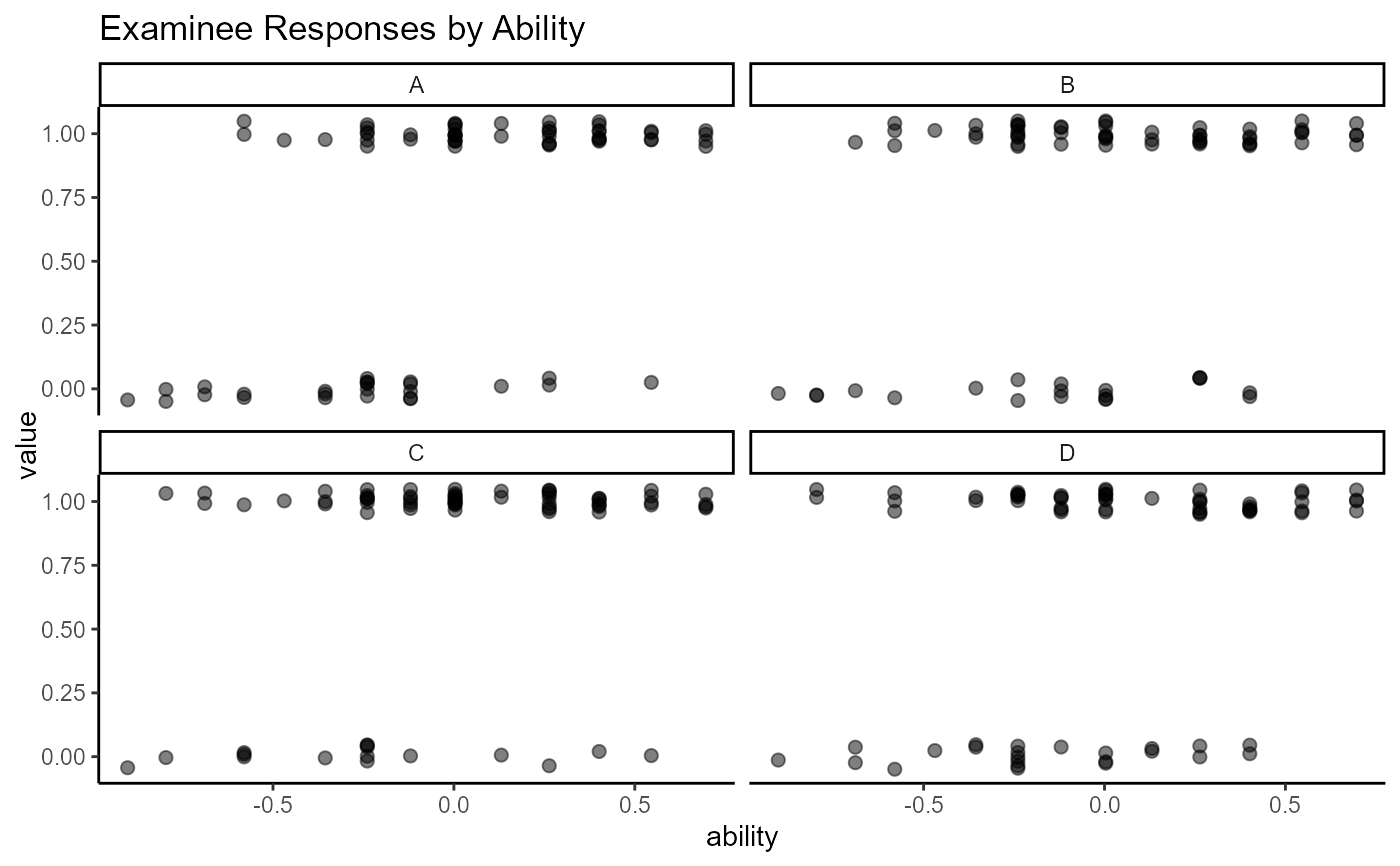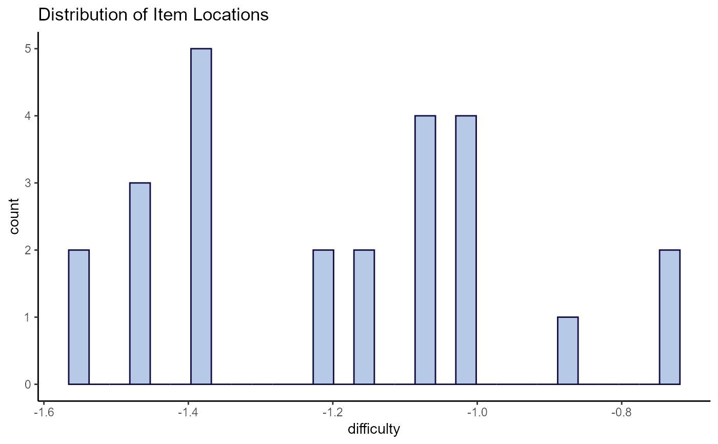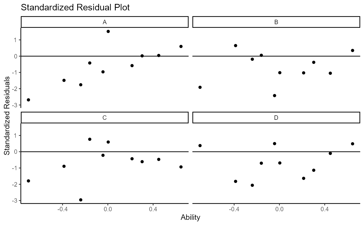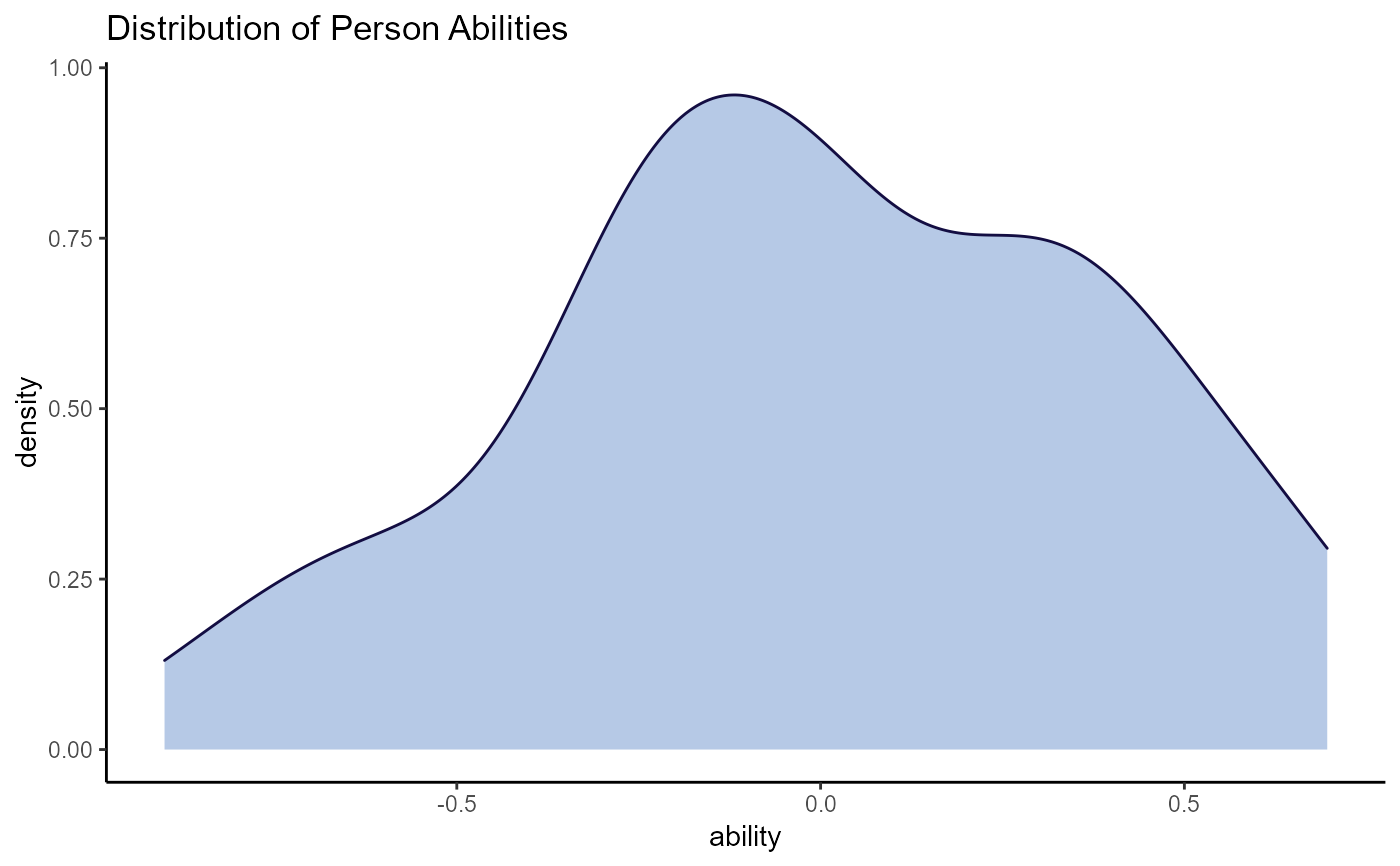 All plots in wizirt use ggplot2 as a backend. Type 'theta_diff' also uses gghalves. For the item-focused plots, the types can be included in the same string to overlay the plots (e.g. resid_trace). For large numbers of persons and/or items, you may want to consider limiting the number printed at a time on some plots.
